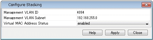 | Configure Stackingボタン | 管理用VLAN のIDやサブネットのIPアドレスを設定するダイアログを開く |