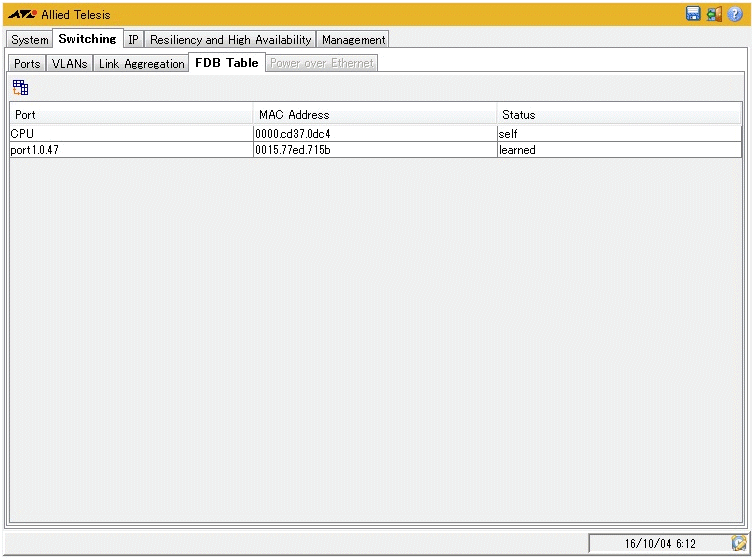 | FDB Table | フォワーディングデータベース(MACアドレステーブル)の内容を表示する。ポート番号、MACアドレス、ステータスが表示される。ステータスの意味は以下のとおり。self:自身のMACアドレス。バーチャルMACアドレスも含む。learned:ダイナミックエントリー。mgmt:スタティックエントリー |