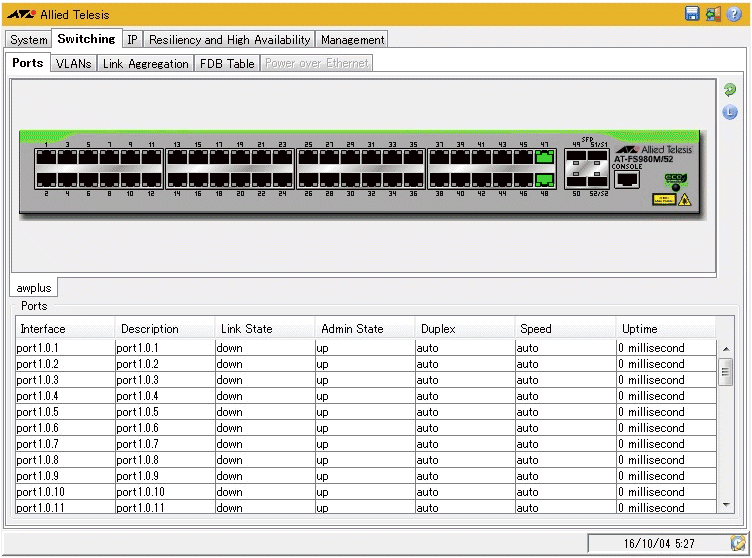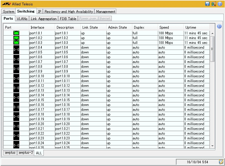 | Ports | ポート番号、リンクステータス、管理ステータス、デュプレックスモード、通信速度や稼働時間(ミリ秒単位)が表示される |