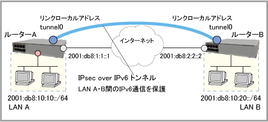 なお、前提事項として、ルーターA・BはIPv6でインターネットに接続しているものとします。WAN側インターフェースのIPv6アドレスは固定であり、ルーター間でのIPv6通信もできているものとします。