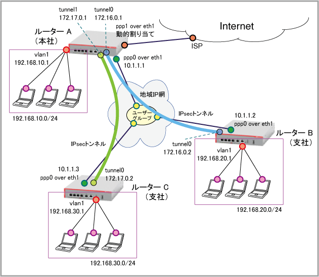 | WAN側(ppp0)IPアドレス | 10.1.1.1/32 | 10.1.1.2/32 | 10.1.1.3/32 |