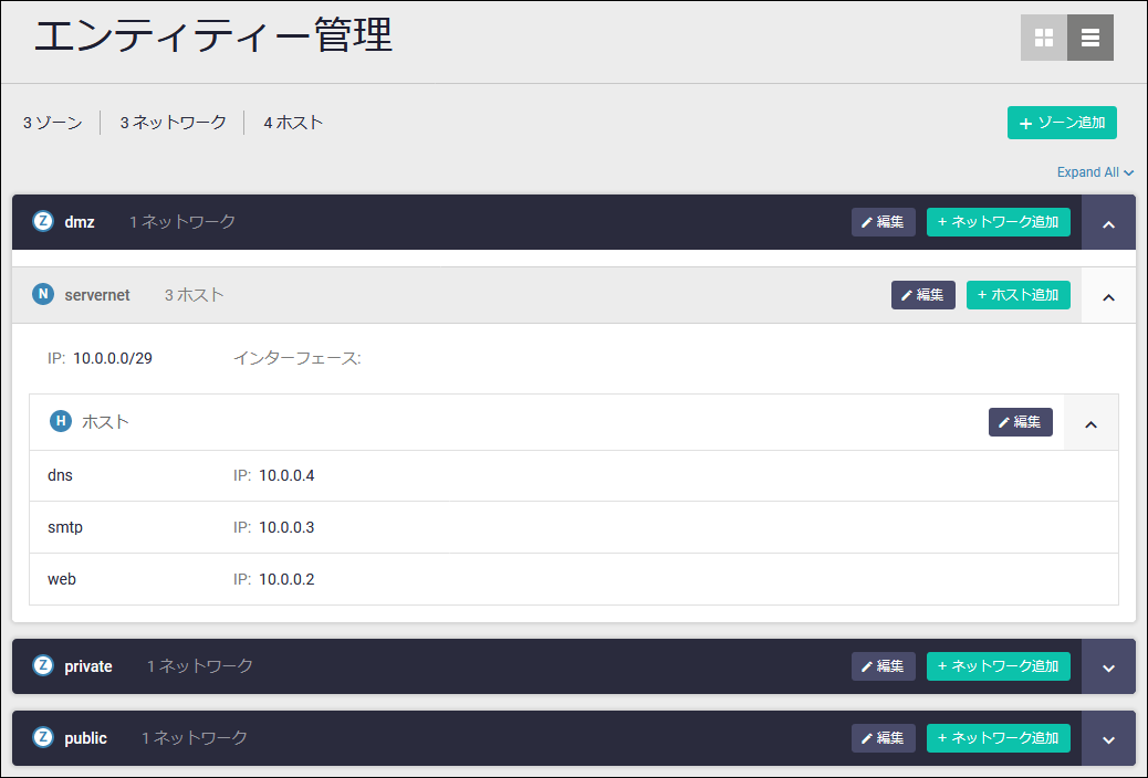 | ∨ | ゾーン、ネットワーク、ホスト項目右側の下向き矢印をクリックすると、該当項目が展開され、該当項目の内容や下位項目が表示されます |