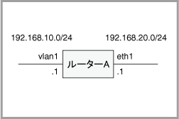- 直接接続されていないネットワーク192.168.10.0/24へのスタティック経路を登録します。同ネットワーク宛てのパケットは、ルーターAのeth1インターフェース(192.168.20.1)に転送します。