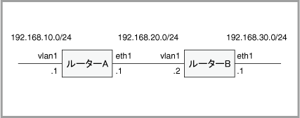 ここでは例として、次のようなネットワークにおけるルーターAとBの設定を示します。