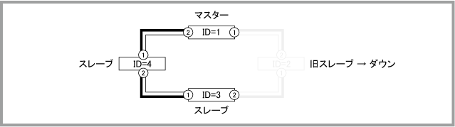 Noteマスター(ID=1)の正常起動後にポートがリンクアップして通信が可能な状態になりますが、通信が復旧するまでの時間は、ネットワーク環境と使用しているプロトコルの復旧時間に依存します。マスター(ID=1)は正常起動するまでポートをリンクアップしません。旧マスター(ID=2)も再起動中はリンクダウンするため、マスター(ID=1)がコンフィグを読み込んでから正常起動するまでの間、一時的にVCSグループの全ポートがリンクダウンしている状態になります。