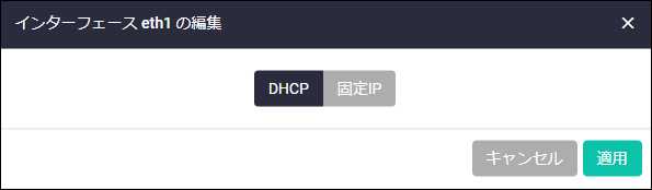 | IPアドレス | 対象インターフェースに設定するIPv4アドレスを「192.168.101.1/24」の形式で入力してください。空欄(未定義)の状態で「適用」ボタンを押した場合は該当インターフェースのIPv4アドレスが削除されます |
