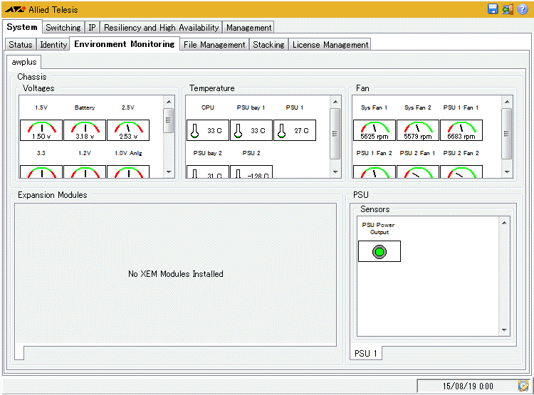 | Chassis | 本体の電圧状態(Voltage)、内部の温度状態(Temperature)、ファンの状態(Fan)が表示される |