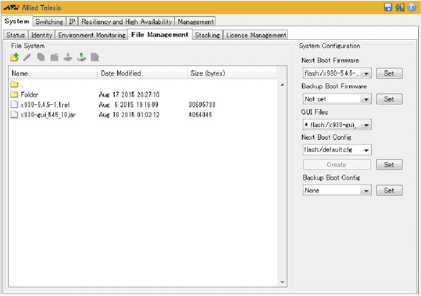 | System Configuration | 通常用またはバックアップ用ファームウェアイメージファイル、GUIファイルや起動時コンフィグの設定を行う |