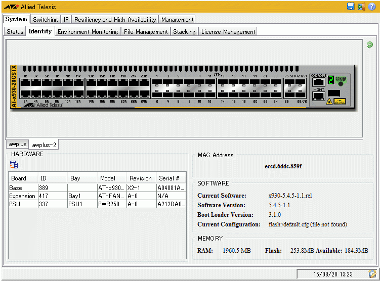 | HARDWARE | スイッチ本体や拡張モジュールなどのハードウェア情報を表示する。表示されるのは、製品(部品)の種類、種類を示すID番号、スロット番号、名称、ハードウェアリビジョンやシリアル番号 |