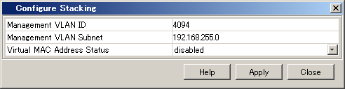 | Configure Stackingボタン | 管理用VLAN のIDやサブネットのIPアドレスを設定するダイアログを開く |