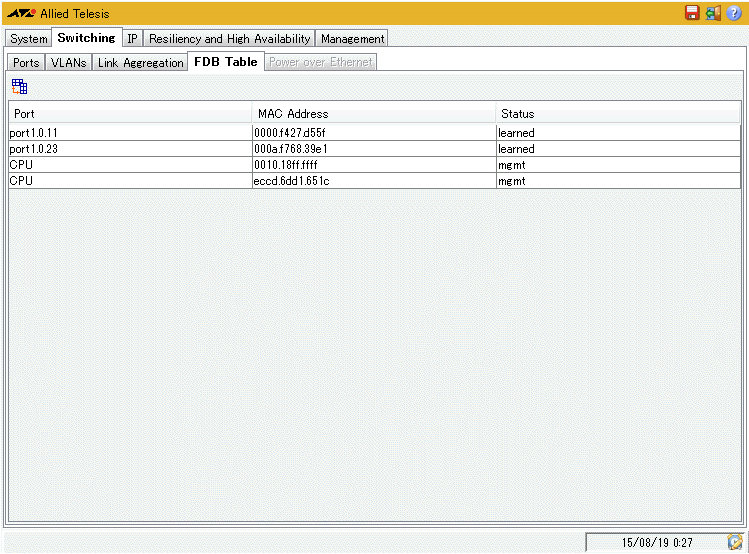 | FDB Table | フォワーディングデータベース(MACアドレステーブル)の内容を表示する。ポート番号、MACアドレス、ステータスが表示される。ステータスの意味は以下のとおり。self:自身のMACアドレス。バーチャルMACアドレスも含む。learned:ダイナミックエントリー。mgmt:スタティックエントリー |