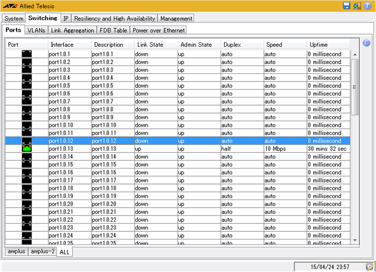 | Ports | ポート番号、リンクステータス、管理ステータス、デュプレックスモード、通信速度や稼働時間(ミリ秒単位)が表示される |