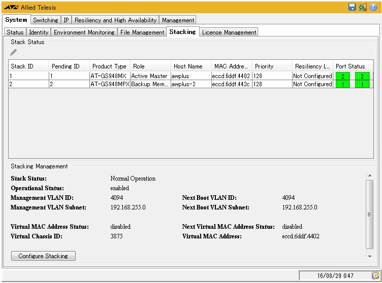 | Stacking Management / Virtual MAC Address Status | バーチャルMACアドレスのステータス |