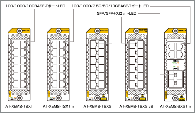 表 1 ポート 通信速度 スタックポート数 SFP+スタックモジュール(AT-XEM2-12XS, AT-XEM2-12XS v2, AT-XEM2-8XSTm) 10Gbps 最大8ポート 100/1000/10GBASE-Tポート(AT-XEM2-12XT) 100/1000/2.5G/5G/10GBASE-Tポート(AT-XEM2-12XTm, AT-XEM2-8XSTm) QSFP+スタックモジュール(AT-XEM2-4QS) 40Gbps 最大4ポート QSFP28スタックモジュール(AT-XEM2-1CQ) 100Gbps 最大2ポート