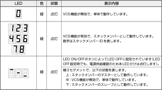 | L/A | 緑 | 点灯 | 2.5/5/10Gbpsでリンクが確立しています。 |