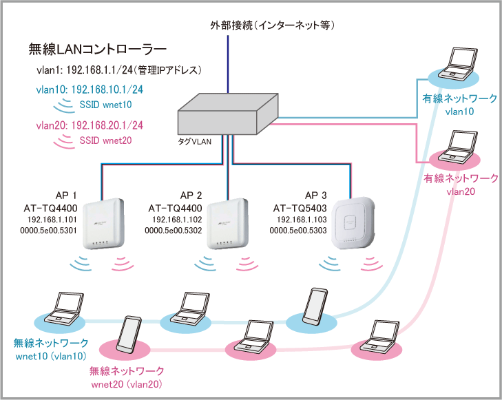| 1 | 192.168.1.0/24 | 無線LANコントローラーと管理下APの通信に使用する管理用VLAN |