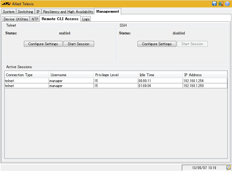 | Telnet / Start Session ボタン | セッションを開始する。セッションが開始されたら、CLIでログインする |