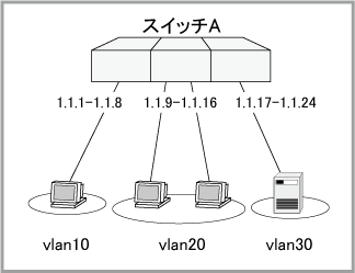 これで、物理的には1台のスイッチでありながら、ネットワーク的には3台のスイッチに分割されたような状態となります。vlan10、20、30は完全に独立しており、互いに通信することはできません。