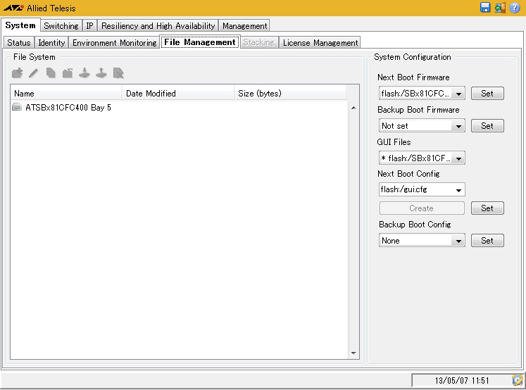 | System Configuration | 通常用またはバックアップ用ファームウェアイメージファイル、GUIファイルや起動時コンフィグの設定を行う |