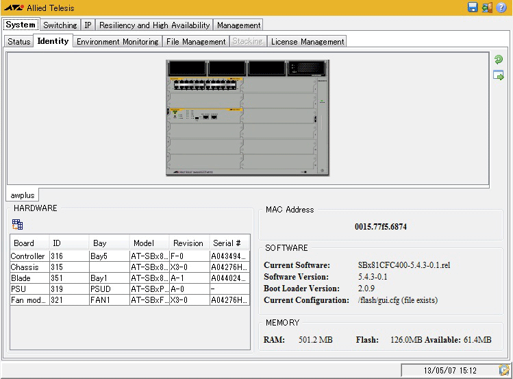 | HARDWARE | スイッチ本体や拡張モジュールなどのハードウェア情報を表示する。表示されるのは、製品(部品)の種類、種類を示すID番号、スロット番号、名称、ハードウェアリビジョンやシリアル番号 |