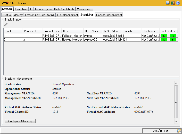| Stacking Management / Virtual MAC Address Status | バーチャルMACアドレスのステータス |