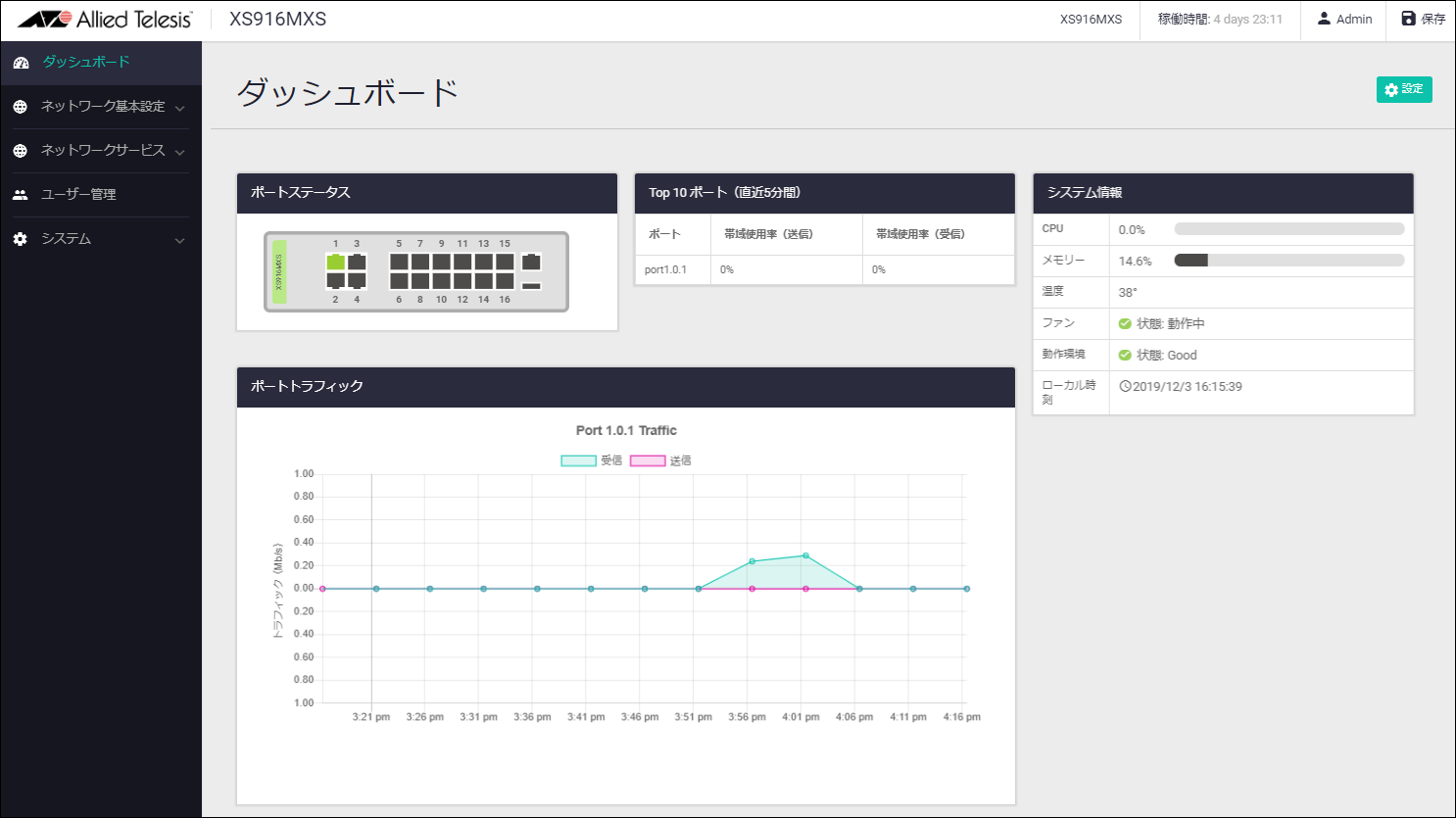 ログイン直後は、Web GUIのホーム画面であるダッシュボード画面が表示されます。