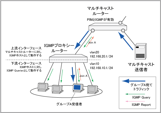 IGMPプロキシーは、通常のルーター(ユニキャストルーター)として動作している場合に、マルチキャスト経路制御プロトコルを動かすことなく、上位のマルチキャストルーターからマルチキャスト配送を受け、これを末端ネットワークの受信者(ホスト)に転送するための機能です。