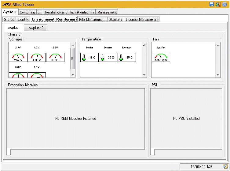 | Chassis | 本体の電圧状態(Voltage)、内部の温度状態(Temperature)、ファンの状態(Fan)が表示される |