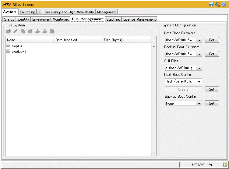| System Configuration | 通常用またはバックアップ用ファームウェアイメージファイル、GUIファイルや起動時コンフィグの設定を行う |