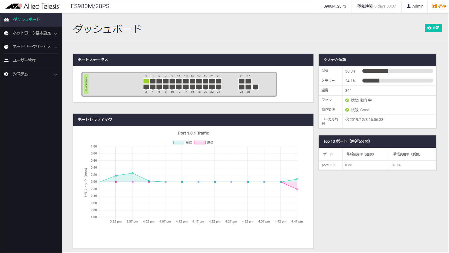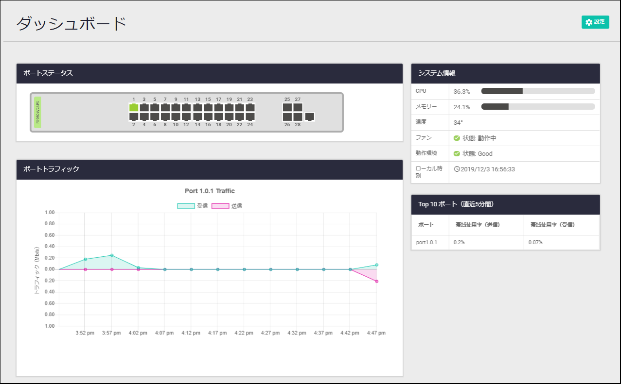 本製品に対する設定は通常 CLI(Command Line Interface)で行いますが、WebブラウザーからGUI(Graphical User Interface)にアクセスして、本製品の動作状態をモニタリングしたり、基本的な機能の設定を行ったりすることも可能です(CLI上で可能な設定がすべてできるわけではありません)。