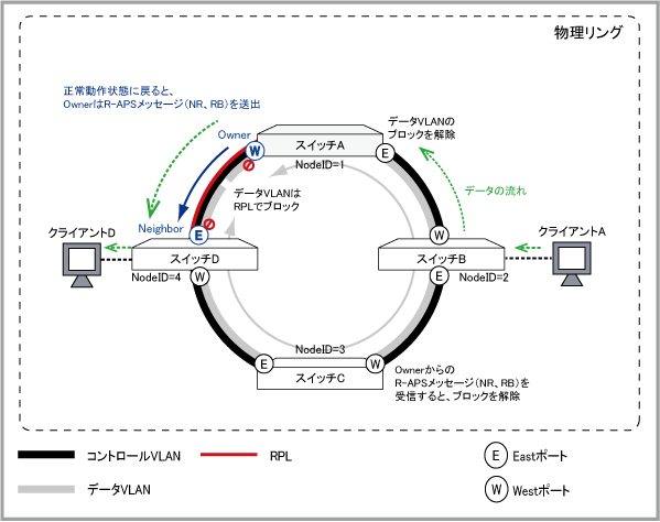 | R-APSメッセージ(NR、RB) | 障害が発生していないことと、RPLがデータVLANに対してブロッキング状態であることを示します。Ownerから同一物理リング内のノードへ送信されます。 |