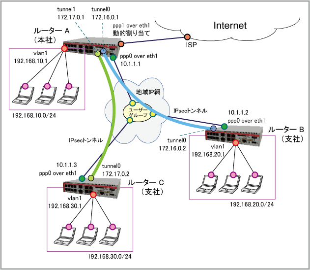 | WAN側(ppp0)IPアドレス | 10.1.1.1/32 | 10.1.1.2/32 | 10.1.1.3/32 |