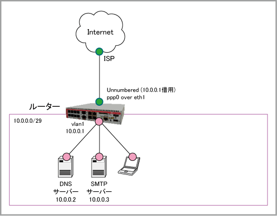 ISPから割り当てられているアドレス(10.0.0.0/29)は8個(10.0.0.0~10.0.0.7)ですが、ネットワークアドレス(10.0.0.0)、ブロードキャストアドレス(10.0.0.7)、ルーター自身のvlan1アドレス(10.0.0.1)にそれぞれ1個ずつ消費されるため、端末に設定できるアドレスは10.0.0.2 ~ 10.0.0.6の5個となります。
