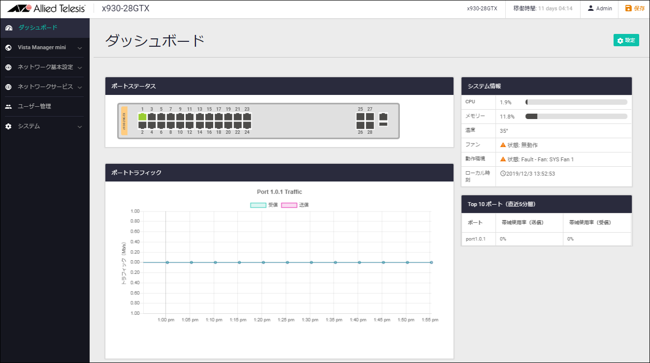 ログイン直後は、Web GUIのホーム画面であるダッシュボード画面が表示されます。