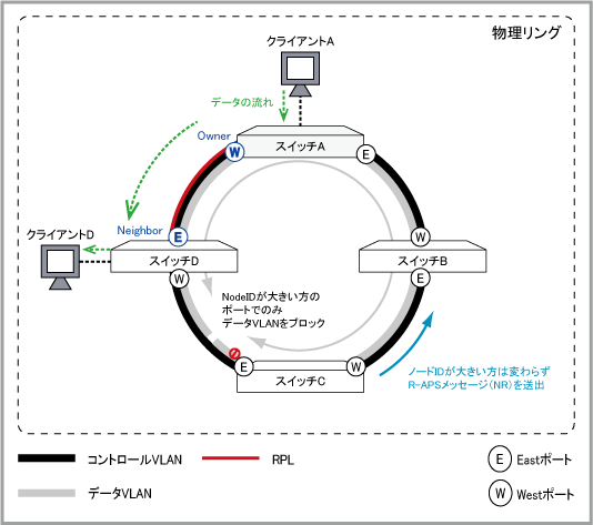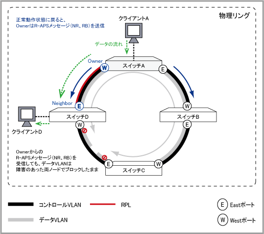 | R-APSメッセージ(NR、RB) | 障害が発生していないことと、RPLがデータVLANに対してブロッキング状態であることを示します。Ownerから同一物理リング内のノードへ送信されます。 |
