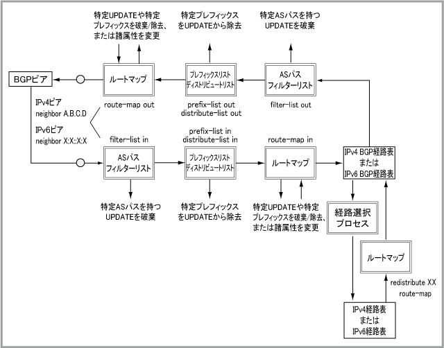 UPDATEメッセージの受信時に特定の経路を受け入れないよう設定したり、UPDATEメッセージの送信時に特定の経路を通知しないように設定したりする。また、受信した経路の属性を変更してから受け入れたり、経路の属性を変更してから送信したりすることもできる |
