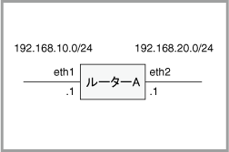 - 直接接続されていないネットワーク192.168.10.0/24へのスタティック経路を登録します。同ネットワーク宛てのパケットは、ルーターAのeth2インターフェース(192.168.20.1)に転送します。