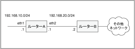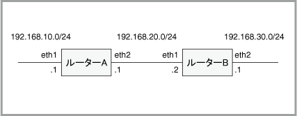 ここでは例として、次のようなネットワークにおけるルーターAとBの設定を示します。