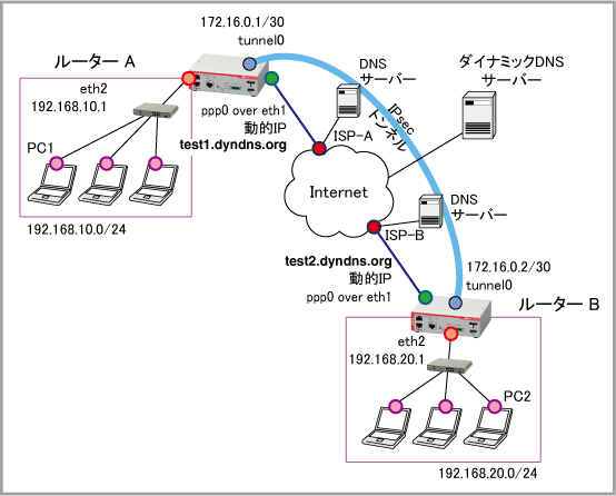 ダイナミックDNSサービスに障害が発生した場合、IPsec VPNの確立が行えない場合があります。信頼性が必要とされるネットワークでは、固定IPアドレス契約の利用をご検討ください。
