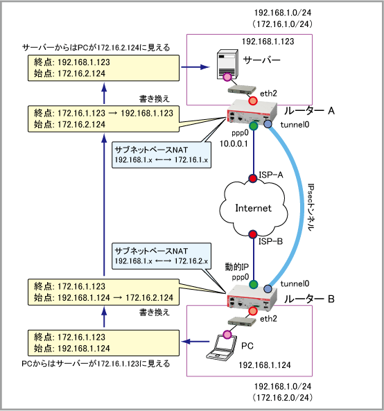 LAN側(eth2)内部NAT後IPアドレス | 172.16.1.x/24 | 172.16.2.x/24 |
