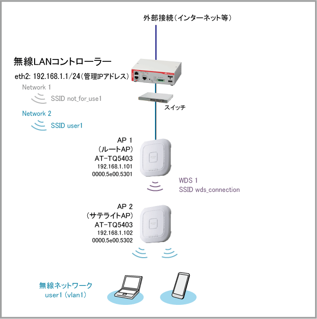WDSでは、無線LANコントローラー管理下のネットワークに直接接続された無線APをルートAP、WDS接続を経由して無線LANコントローラー管理下のネットワークと通信を行う無線APをサテライトAPと呼びます。