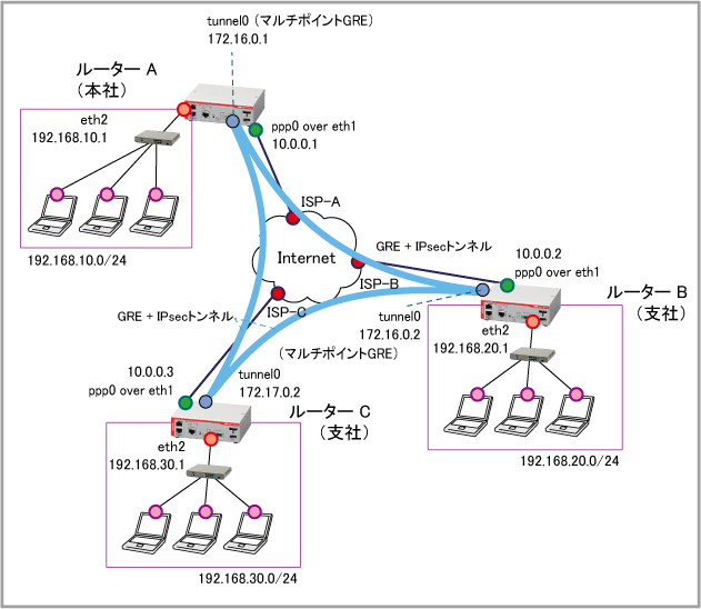 WAN側(ppp0)IPアドレス | 10.0.0.1/32 | 10.0.0.2/32 | 10.0.0.3/32 |