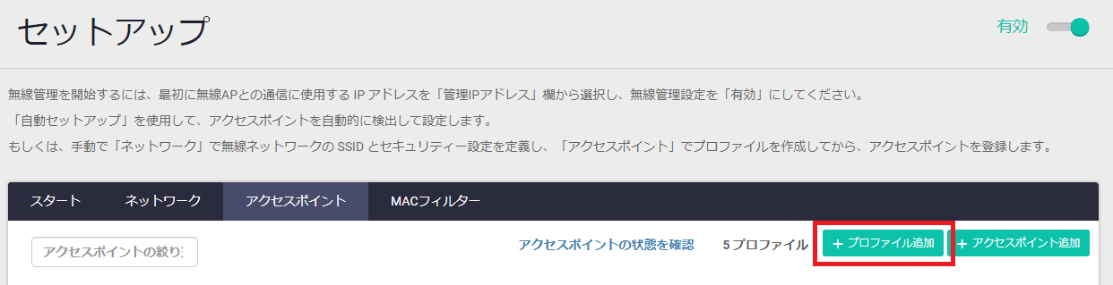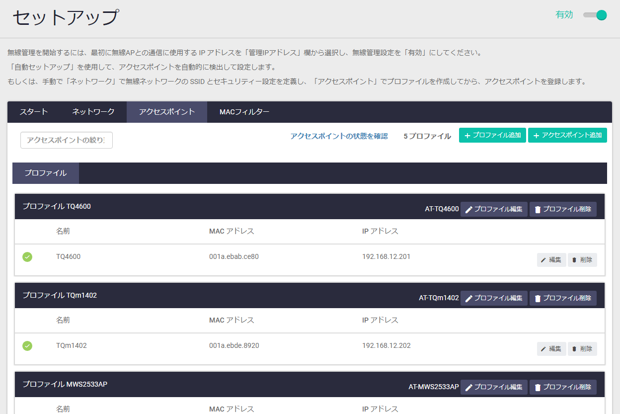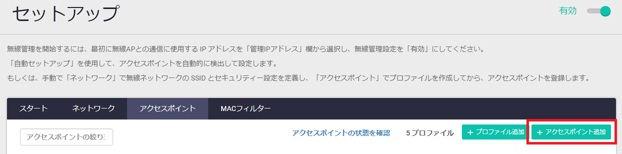 Note以下の条件に当てはまる場合、どれか1つのAPでも異なるAPプロファイルに変更すると、残りのAPの設定状態も変更有となります。