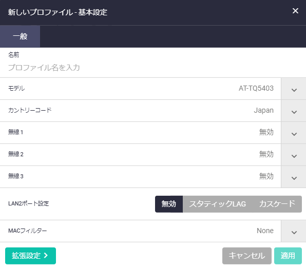 LAN2ポート設定 | 対象APプロファイルにおけるLAN2ポートの利用方法(無効/リンクアグリゲーション/ポートカスケード)を選択する。 |