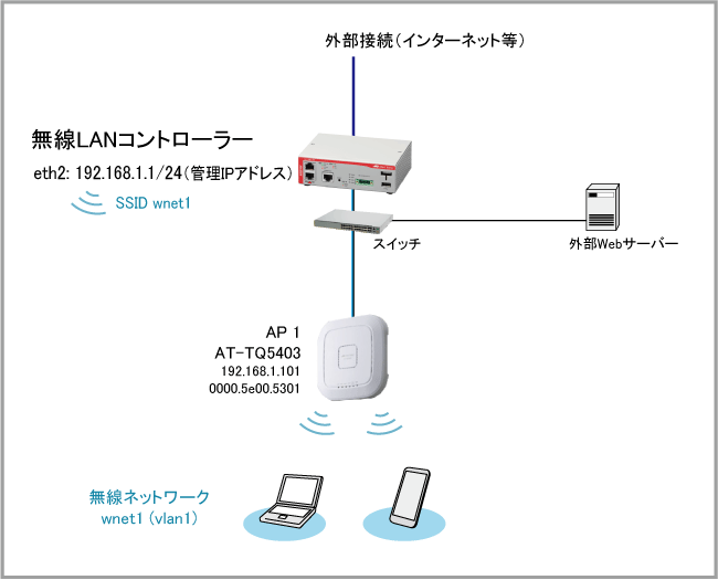 Note無線クライアントに割り当てられるIPアドレスから無線APのIPアドレスを参照できるよう、無線APの上位のスイッチ側で適切に設定する必要があります。また、AT-TQ1402/5403/5403e、AT-TQm1402/5403ではキャプティブポータルのTCPポート番号として8080(HTTP)および8443(HTTPS)を使用しますので、上位のスイッチにてアクセスリストを適用している場合は、該当TCPポートの通信を許可する必要があります。