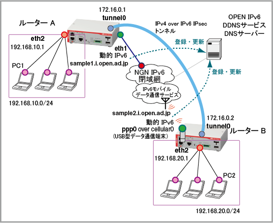 本設定例では、ソフトイーサ社が提供する「OPEN IPv6 ダイナミック DNS for フレッツ・光ネクスト」サービスを利用して、フレッツ・光ネクスト網とIPv6モバイルデータ通信サービス網内のIPv6折り返し通信でIPv4 over IPv6 IPsec VPNを構築し、拠点間をレイヤー3で接続する手順を説明します。