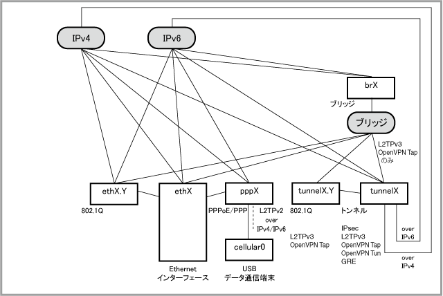 L2TPv3とOpenVPN Tap(L2)トンネルインターフェースはおもにブリッジング用、IPsec、OpenVPN Tun(L3)、GREトンネルインターフェースはIPv4、IPv6のルーティング用インターフェースとして使用します。