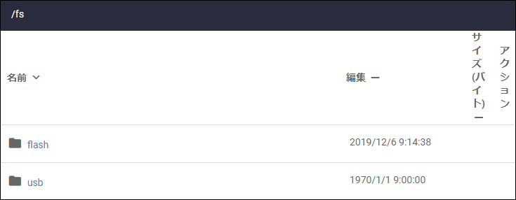 Note機器に接続している外部メディア内のファイルを参照する場合は、ファイル一覧のラベル上にある「/fs」をクリックし、該当の外部メディア名(cardまたはusb)を選択してください(次図参照)。デフォルトでは内蔵フラッシュメモリー(flash)が選択されています。