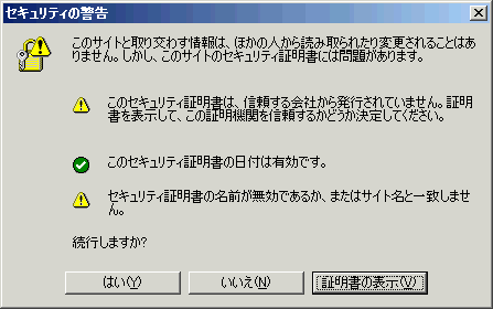 ■ ファームウェア組み込みのSSLサーバー証明書を使う場合、通常Webブラウザーからのアクセス時に次のような警告が表示される(Internet Explorer 6の例)。