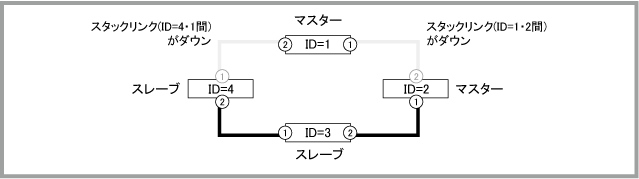 Noteマスター(ID=1)の正常起動後にポートがリンクアップして通信が可能な状態になりますが、通信が復旧するまでの時間は、ネットワーク環境と使用しているプロトコルの復旧時間に依存します。マスター(ID=1)は正常起動するまでポートをリンクアップしません。旧マスター(ID=2)も再起動中はリンクダウンするため、マスター(ID=1)がコンフィグを読み込んでから正常起動するまでの間、一時的にVCSグループの全ポートがリンクダウンしている状態になります。